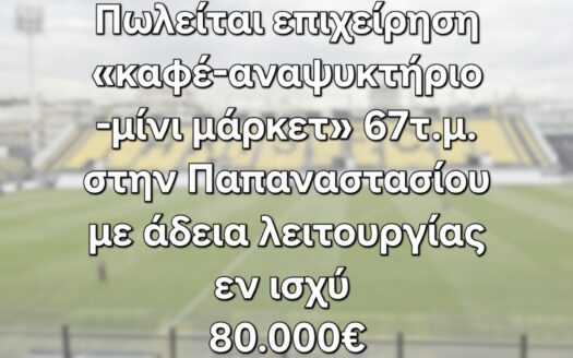 Πωλείται επιχείρηση «Καφέ – Αναψυκτήριο – Μίνι Μάρκετ» (67 τ.μ.) στην οδό Αλεξ. Παπαναστασίου, κοντά στο γήπεδο του Άρη, σε προνομιακό και εμπορικό σημείο με υψ ...